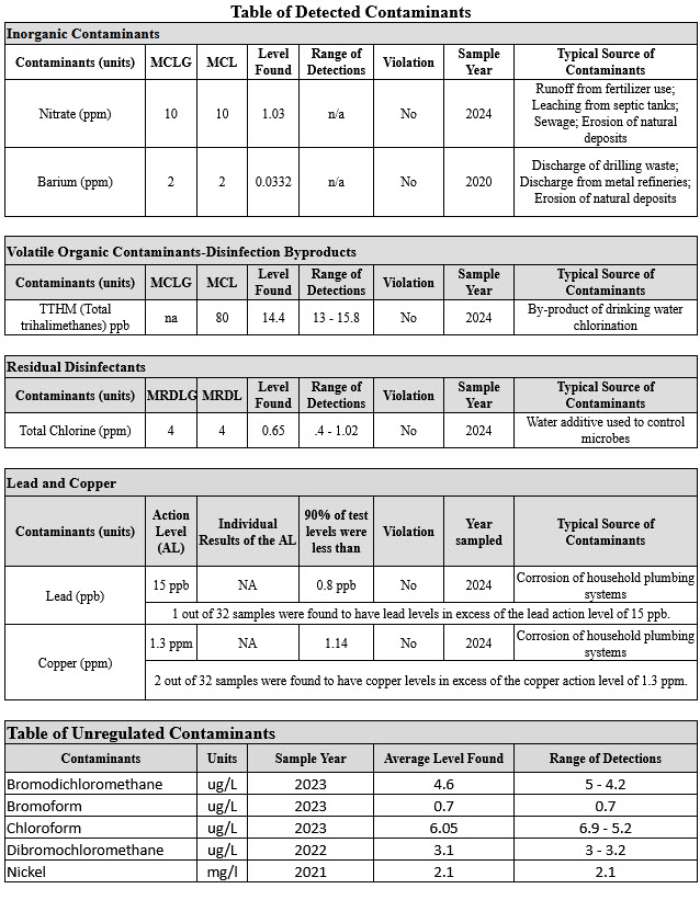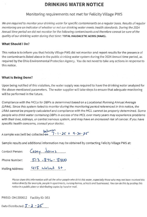 The EPA requires regular sampling to ensure drinking water safety. During 2024, from January 1 to December 31st, the Felicity Water Department conducted sampling for bacteria; inorganic; volatile organic contaminates, most of which were not detected in the Felicity Village Water Supply. Listed in the table below is information on those contaminates that were found in the Felicity Village Water. The Ohio EPA requires us to monitor for some contaminants less than once per year because the concentrations of these contaminates do not change frequently. Some of our data, though accurate, is more than one year old.